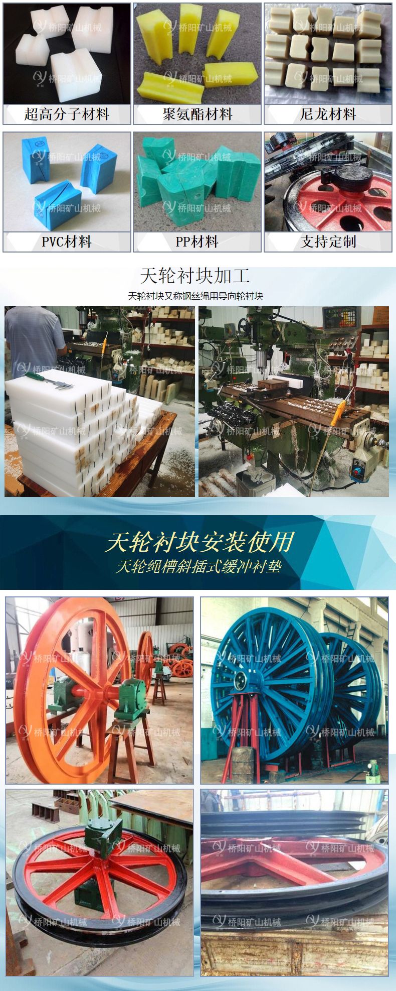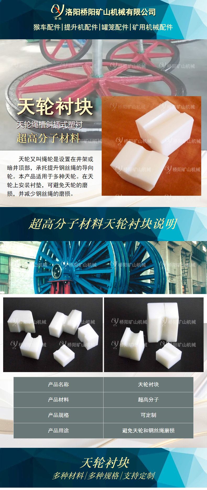 我公司拥有丰富的天轮衬块生产经验,产品型号,模具齐备,并可根据您的要求生产各种形状和材质的产品。