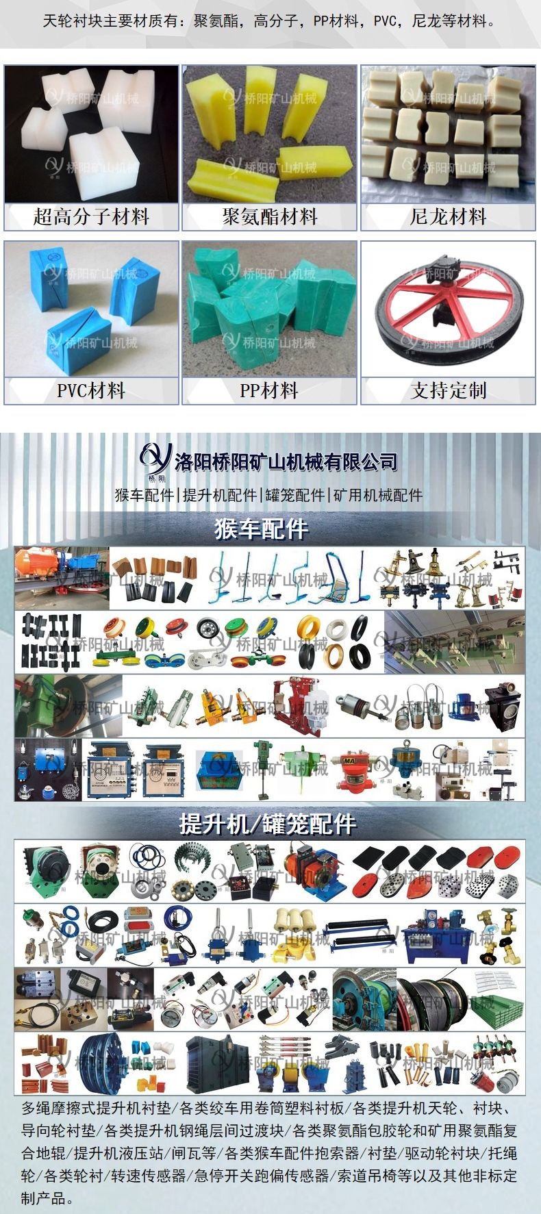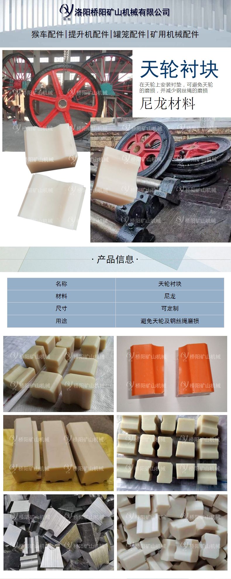 我公司天轮衬块产品型号全,模具全,并可根据您的要求生产各种形状和材质的产品。产品销往多个省市,欢迎新老顾客选购。