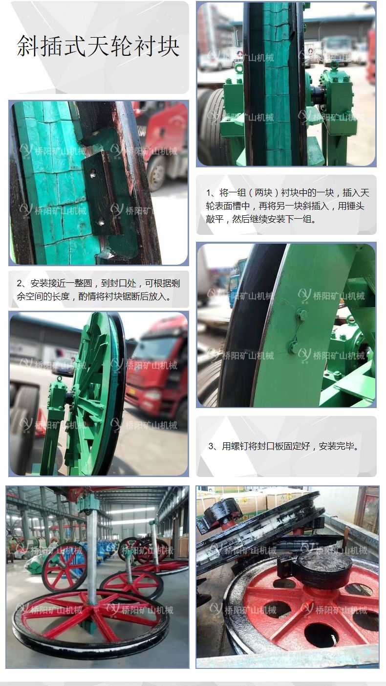 PP天轮衬块主要应用于单绳矿井提升机上。PP天轮衬块消除了现有部分天轮因无绳槽衬垫导致绳槽磨损而更换整个天轮的工作。