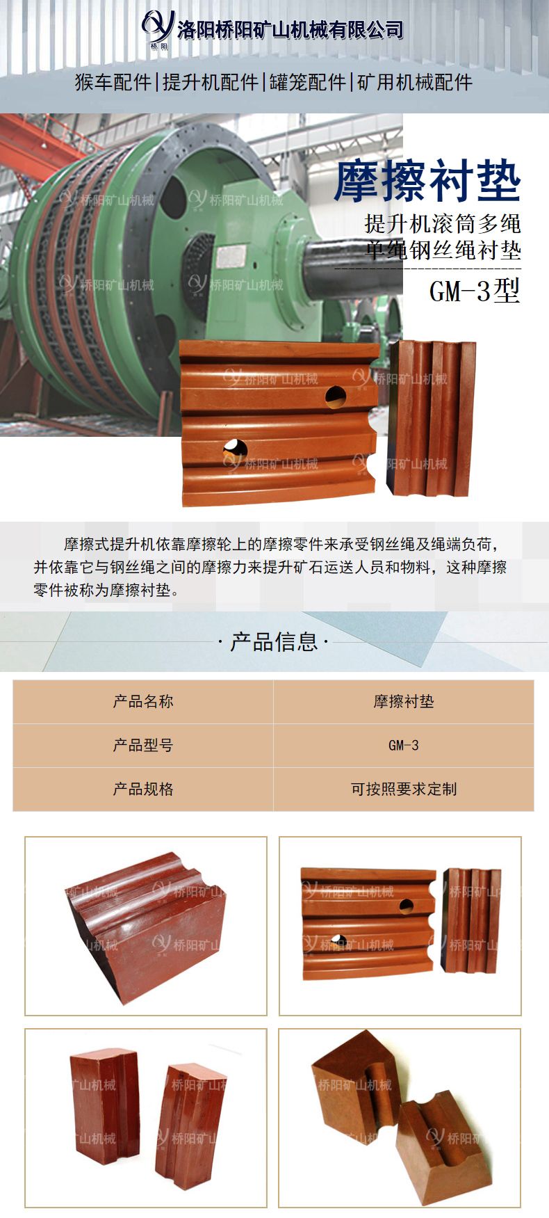 安装于提升机摩擦轮上的摩擦衬垫(简称衬垫),是摩擦式提升机用来驱动钢丝绳、提升载荷的一个比较重要的零件。摩擦式提升机依靠摩擦轮上的摩擦零件来承受钢丝绳及绳端负荷,并依靠它与钢丝绳之间的摩擦力来提升矿石运送人员和物料,这种摩擦零件被称为摩擦衬垫。