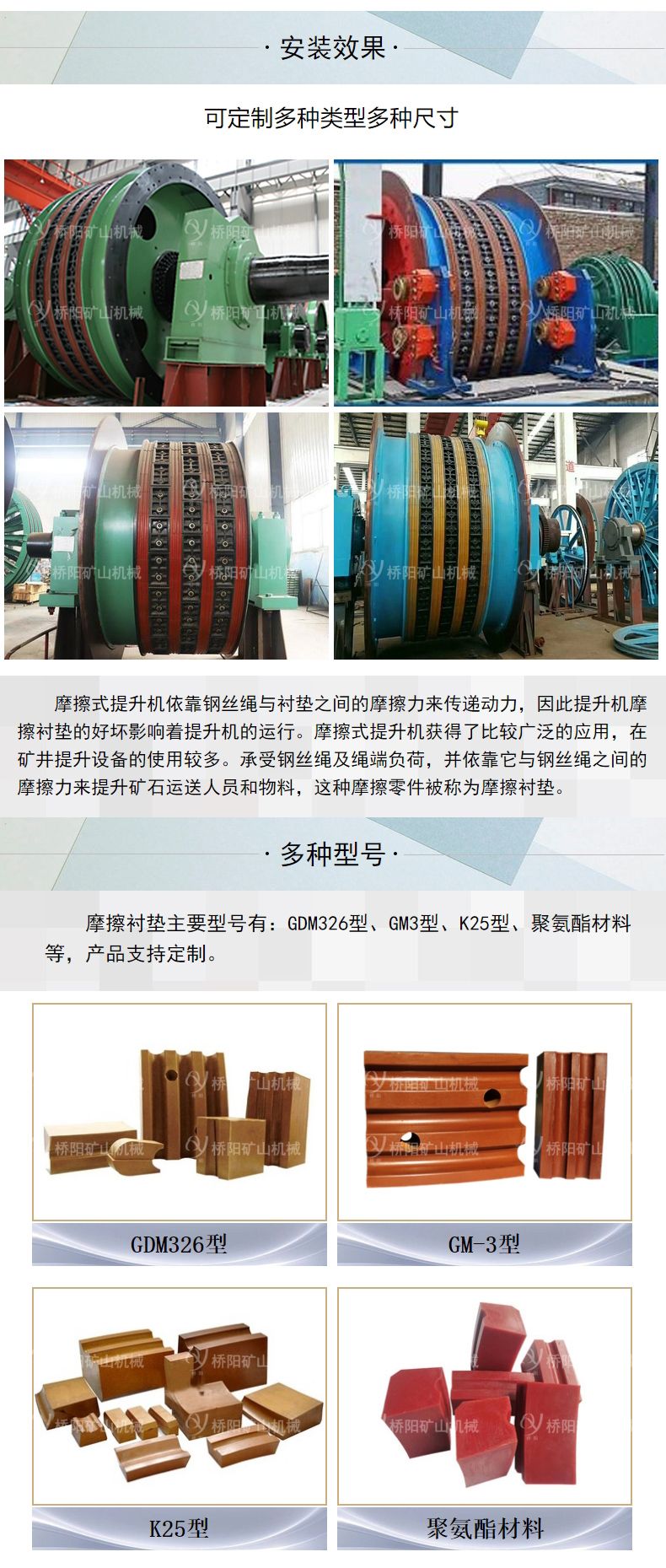 摩擦式提升机获得了比较广泛的应用,在矿井提升设备的使用较多,成为现代提升的发展趋势。承受钢丝绳及绳端负荷,并依靠它与钢丝绳之间的摩擦力来提升矿石运送人员和物料,这种摩擦零件被称为摩擦衬垫。