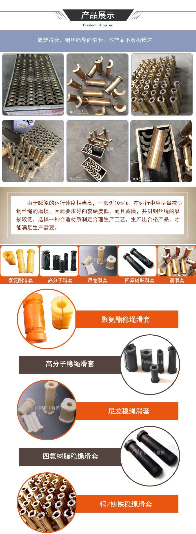 稳绳滑套又名罐笼滑套,钢丝绳导向套,按材料分主要有聚氨酯滑套、尼龙滑套、四氟树脂滑套、高分子滑套,铜滑套,铸铁滑套,以及不锈钢材料。
