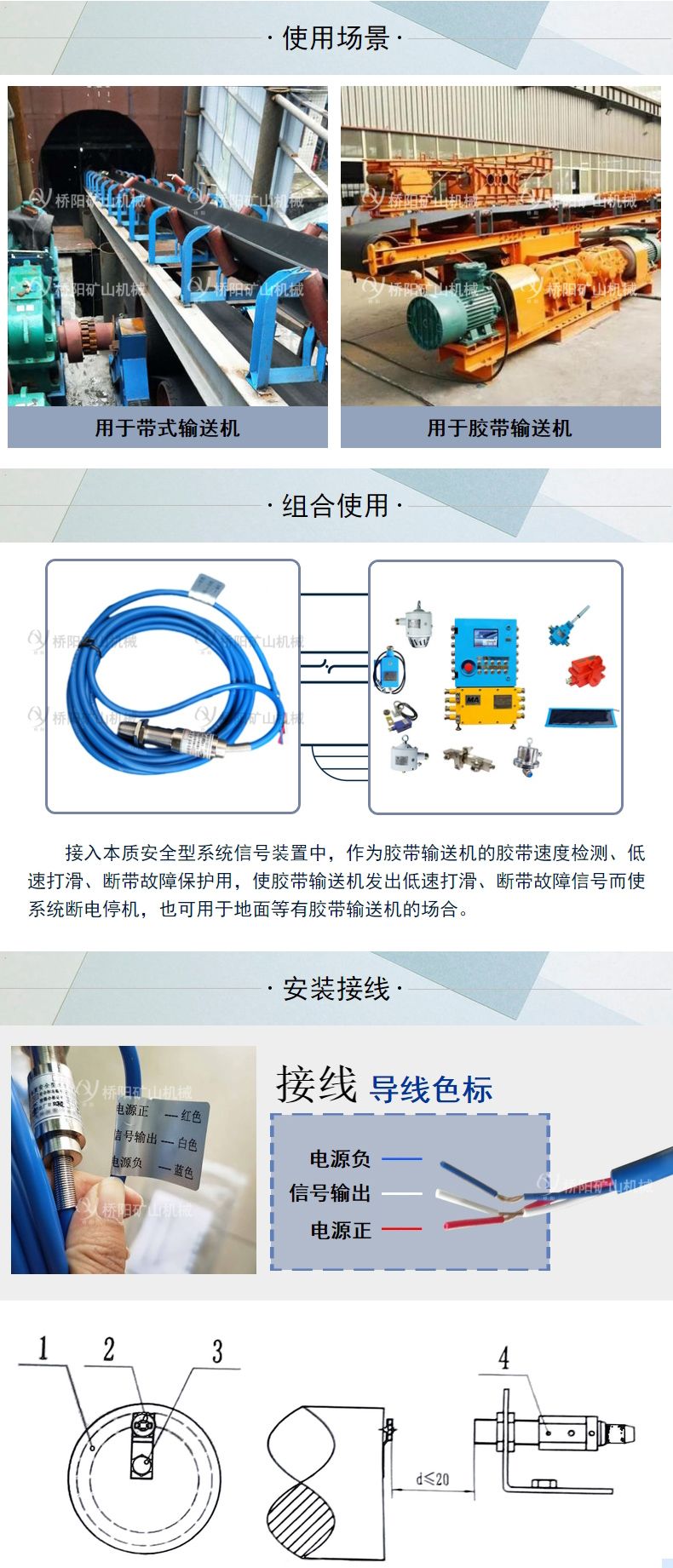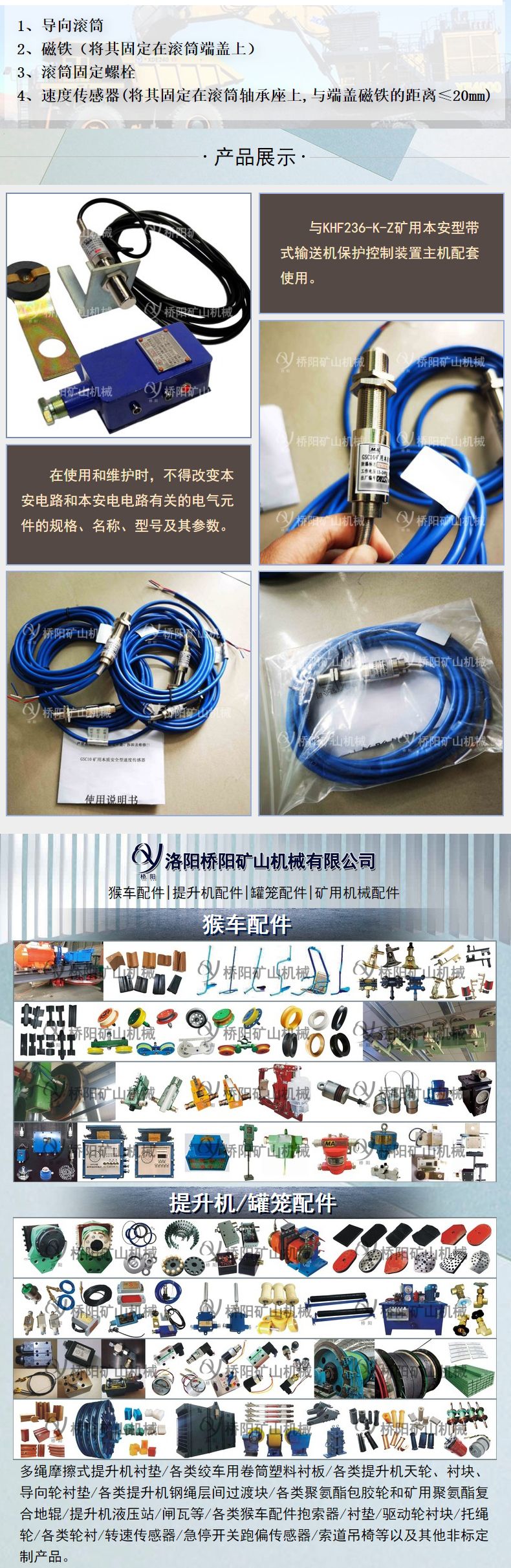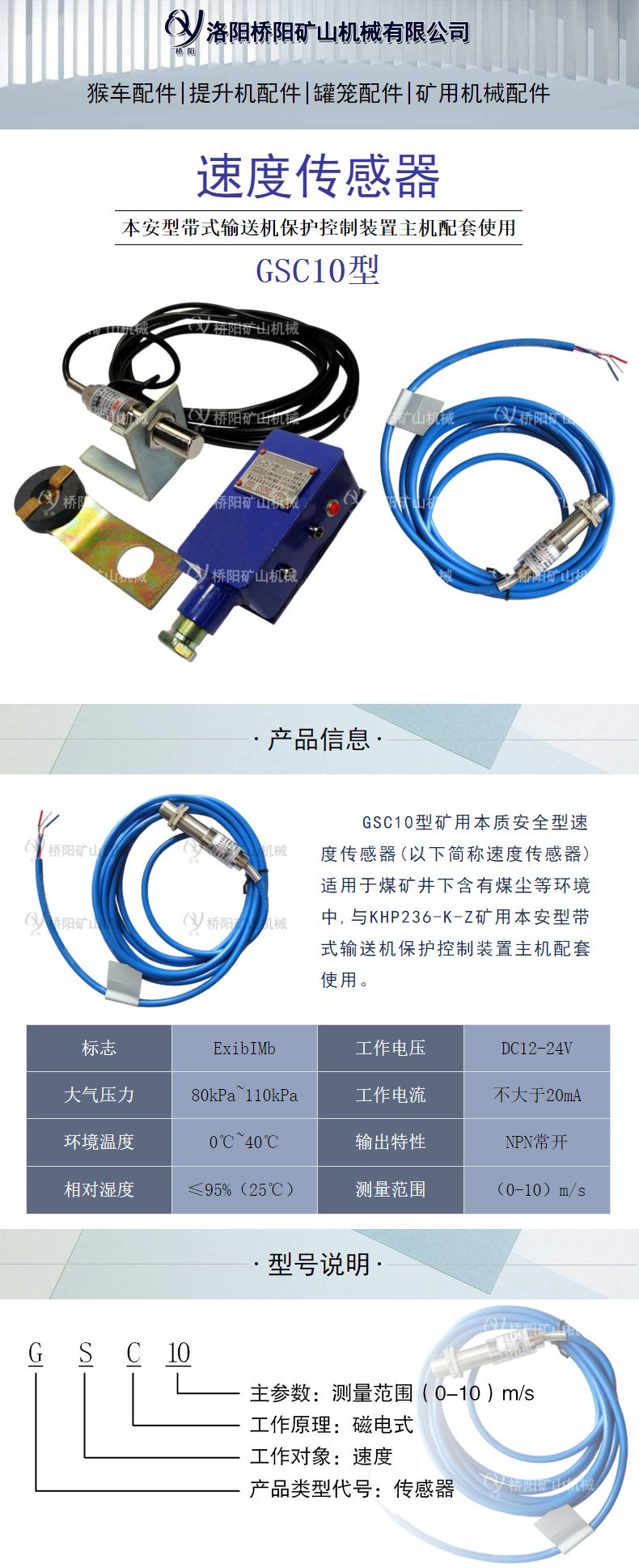 GSC10矿用本质安全型速度传感器(以下简称速度传感器)适用于煤矿井下环境中,与KHF236-K-Z矿用隔bao兼本安型带式输送机保护控制装置主机(以下简称主机)配套使用。接入本质安全型系统信号装置中,作为胶带输送机的胶带速度检测、低速打滑、断带故障保护用,使胶带输送机发出低速打滑、断带故障信号而使系统断电停机,也可用于地面非防bao等有胶带输送机的场合。