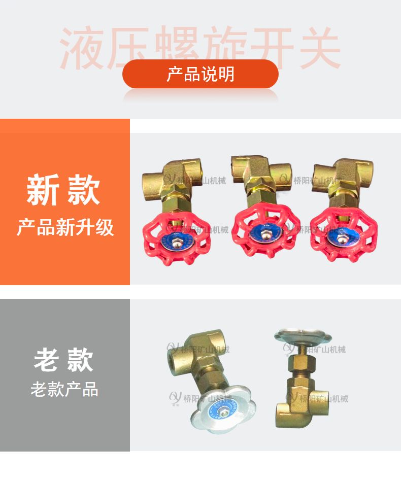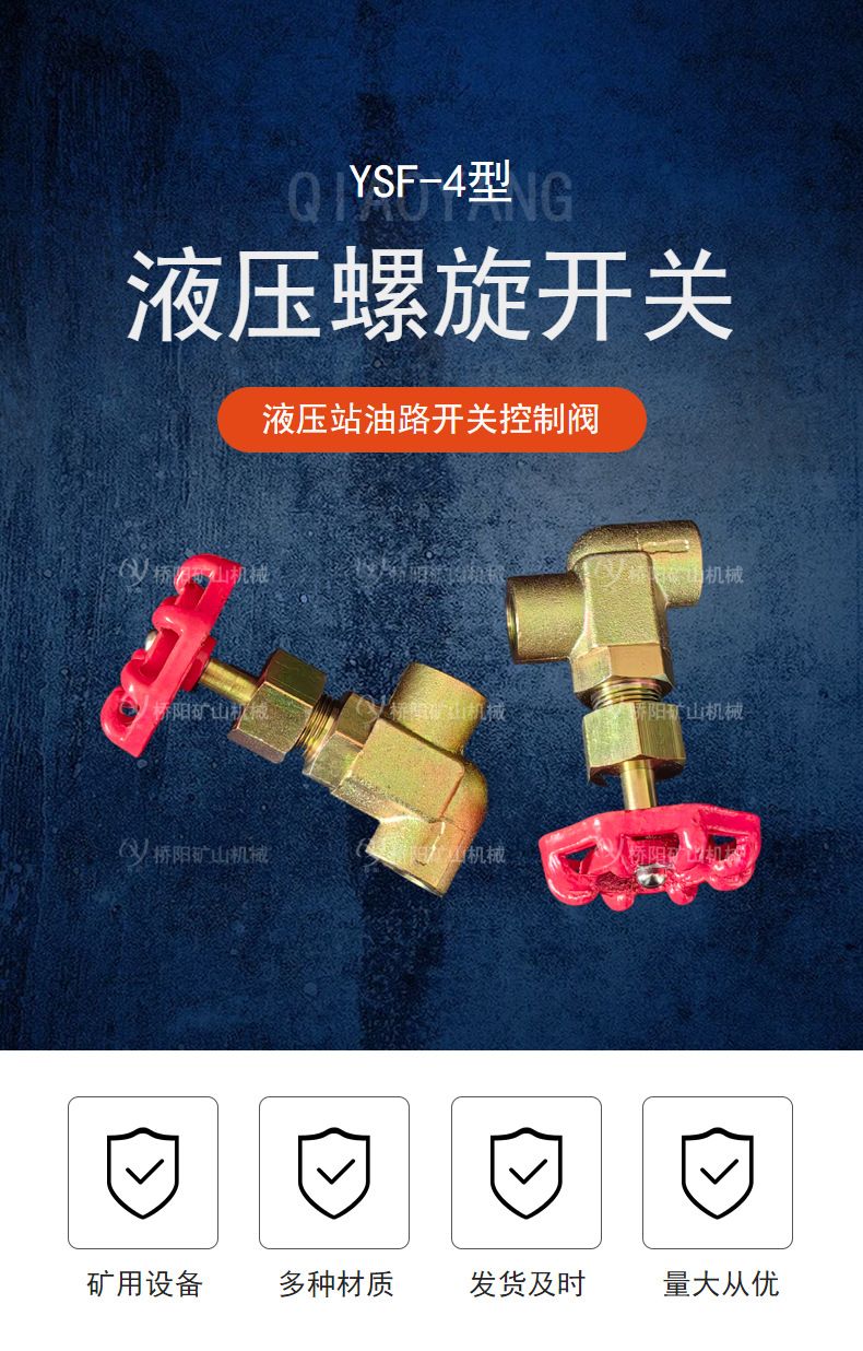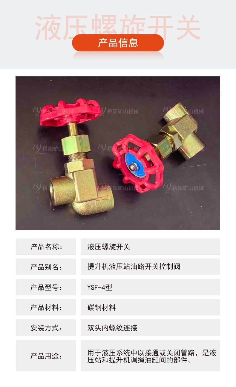 际压螺旋开关主要用于液压系统中,以接通或关闭管路,是液压站和提升机调绳油缸间的部件。可加装压力传感器,用以检测管路压力并参与实现报jing和自动控制。桥阳矿山碳钢液压螺旋开关YSF-4