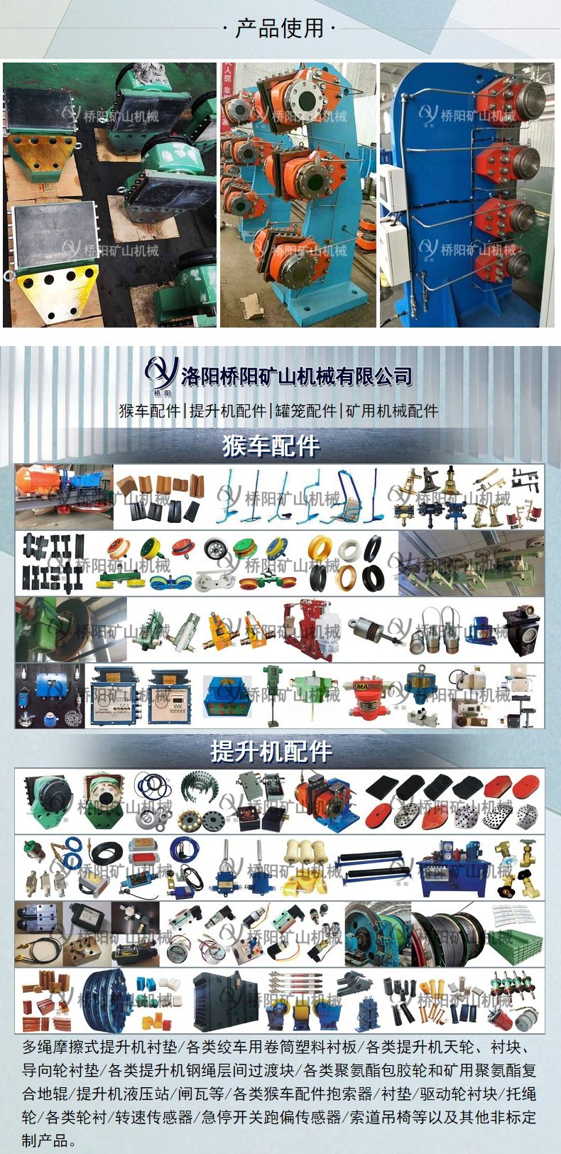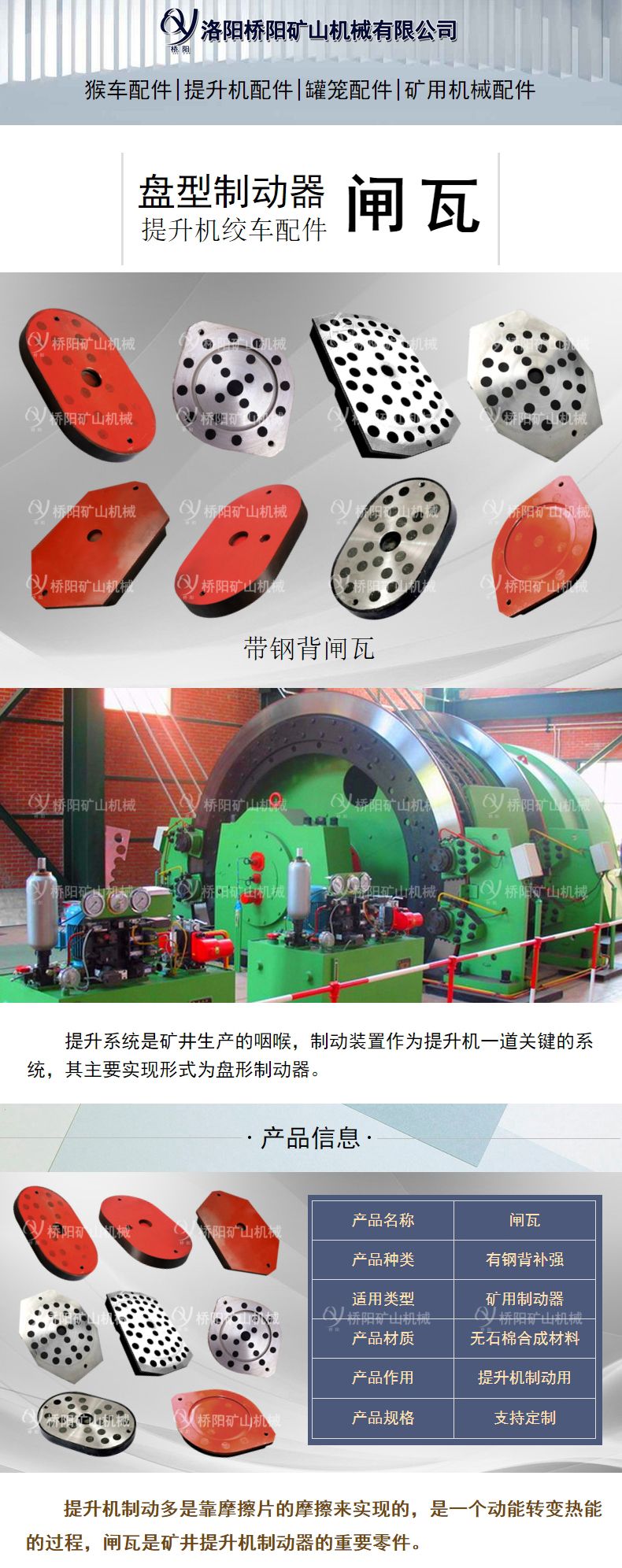 桥阳矿山机械矿用提升机闸瓦,是一种采用树脂基并用其它增强纤维代替石棉的摩阻材料,其特点是: