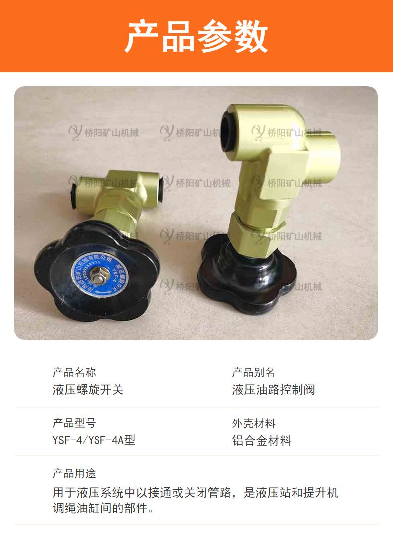 液压螺旋开关是用于液压系统中以接通或关闭管路,是液压站和提升机调绳油缸间的部件,目的是防止因调绳油管意外漏油后造成事故。