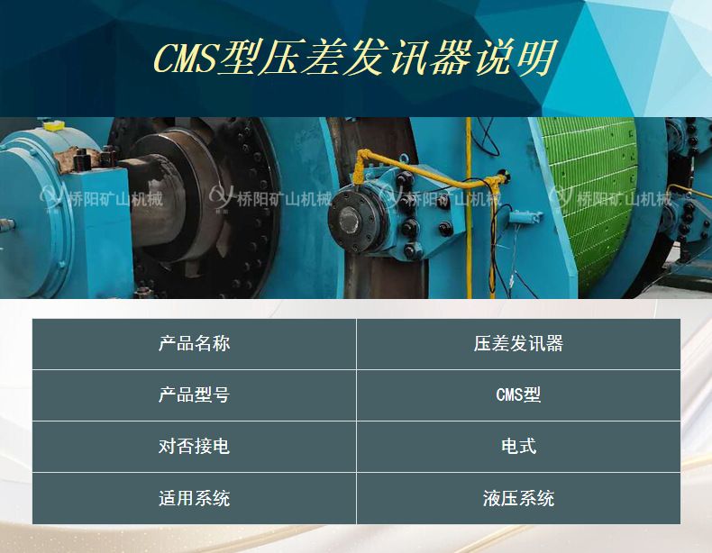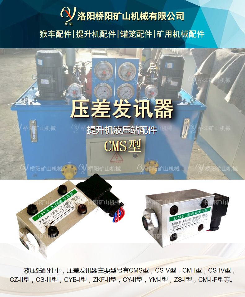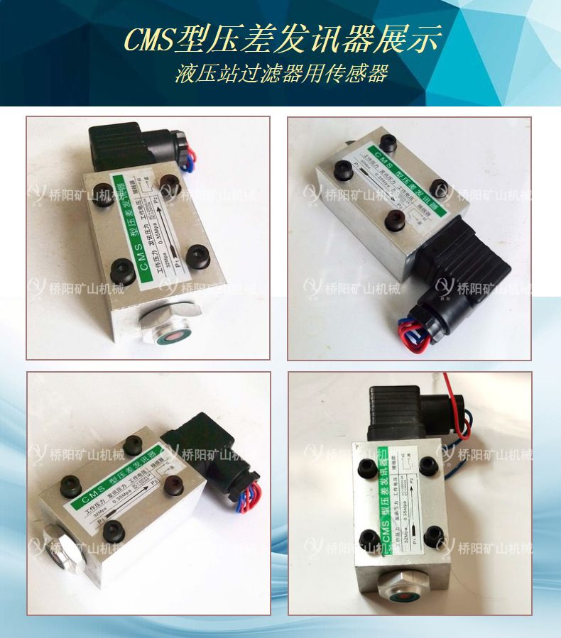 洛阳桥阳矿山生产的CS型压差发讯器,具备诸多特点:在液压系统启动或瞬时流量增减时,不易发出误讯号;不会因碰撞等原因导致原来设定的压差发讯值失准;不但以开关形式发出滤芯堵塞的声音讯号,并可以开关形式切断与液压系统相关的控制电路,达到主机和液压系统正常运行的目的;交直流均可,交流电压达220V。