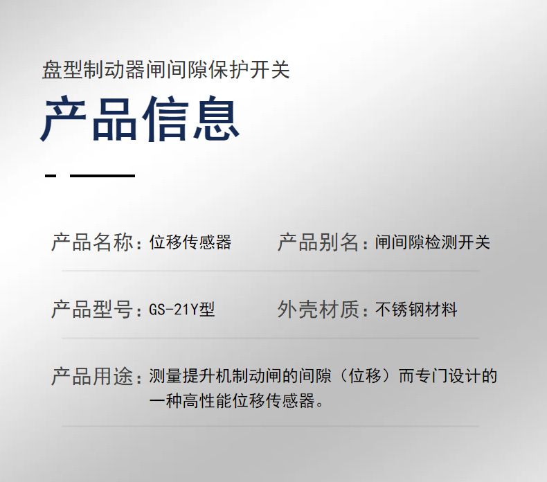 GS-21Y位移传感器是为测量提升机制动闸的间隙(位移)而专门设计的一种高性能位移传感器。