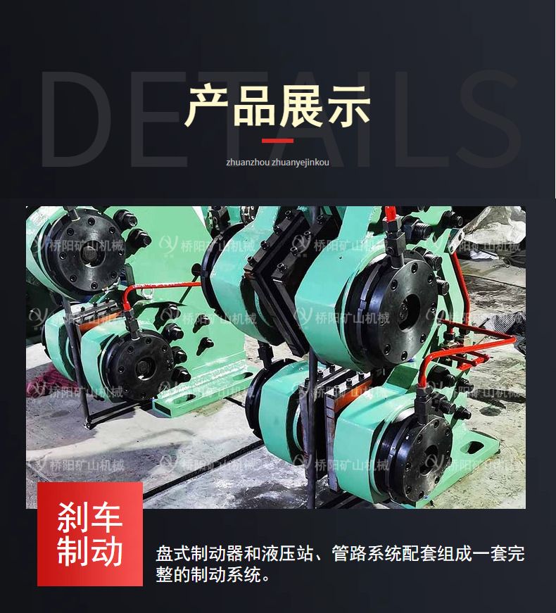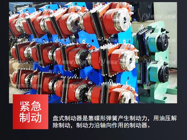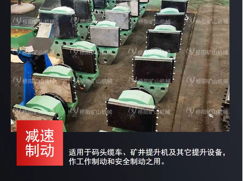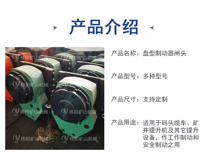 盘式制动器和液压站、管路系统配套组成一套完整的制动系统。适用于码头缆车、矿井提升机及其它提升设备,作工作制动和安全制动之用。