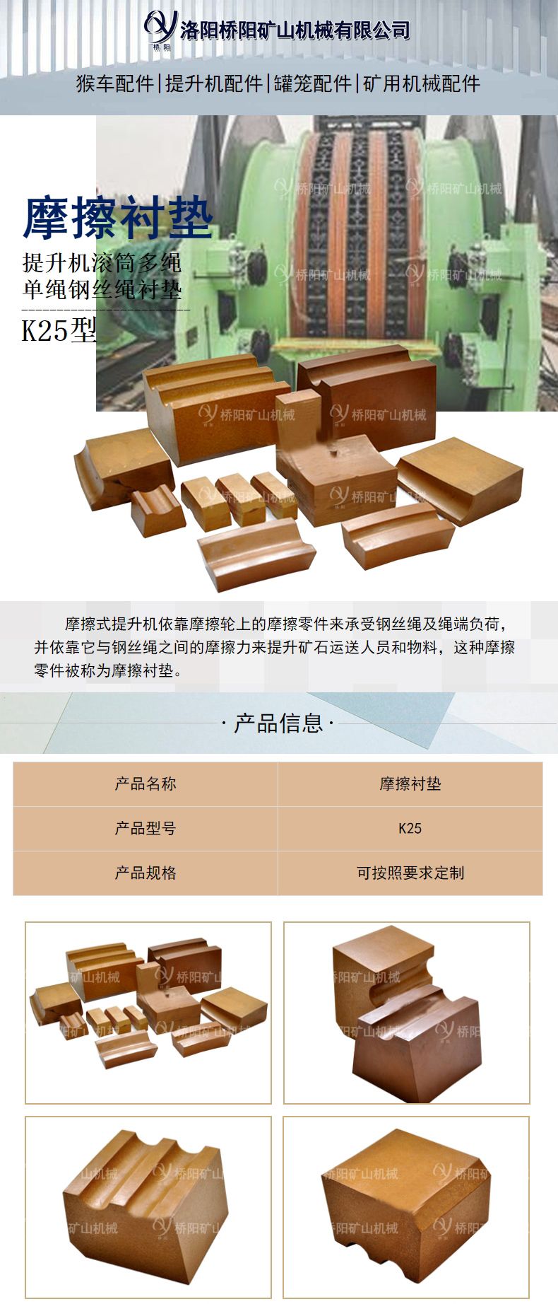 吸收钢丝绳振动能,防止钢丝绳扭转。不会被浸湿。K25具有较好的绳槽可车削性。K25较好的减少了钢丝绳的断丝,延长了钢丝绳的使用周期。安装于提升机摩擦轮上的摩擦衬垫(简称衬垫),是摩擦式提升机用来驱动钢丝绳、提升载荷的一个零件。