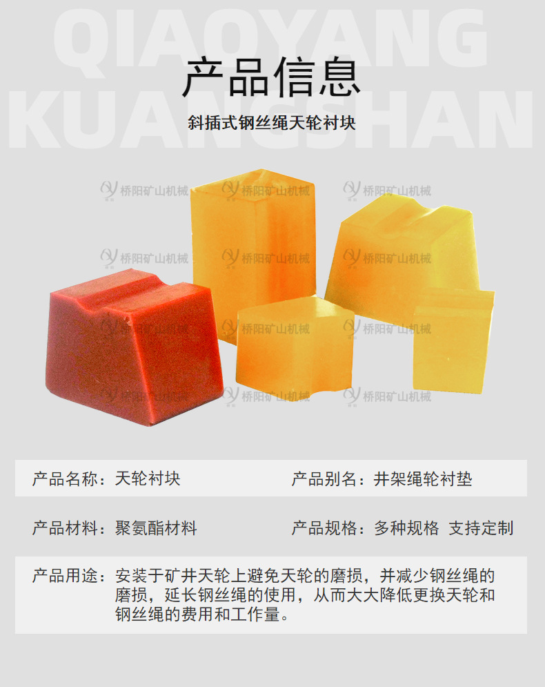 洛阳桥阳矿山机械供应,聚氨酯天轮衬块在天轮上安装衬垫,可避免天轮的磨损,并减少钢丝绳的磨损、延长钢丝绳的使用周期,从而降低了更换天轮和钢丝绳的工作量。生产各种型号、材质的天轮衬块产品,主要材质有高分子衬垫、PP塑料衬垫、PVC天轮衬块、聚氨酯衬块、尼龙天轮衬块等。