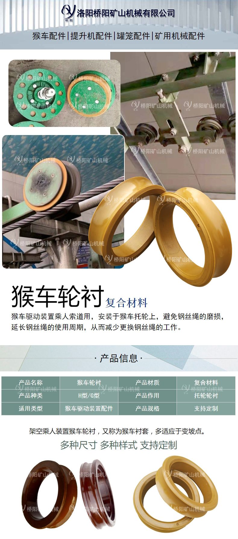 架空乘人装置(猴车)轮衬,又称为衬套,按村质可分为五大类,聚胺酯(黄色)、橡胶(黑色)、工程塑料(青灰色)、尼龙轮衬和复合材料轮衬。目前主要采用的橡胶材质居中多,因其材质较软,乘坐舒适度比较好。