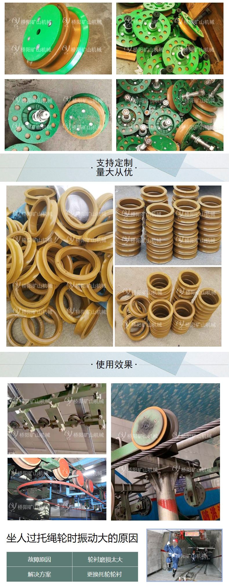 消除了现有部分轮衬因绳槽磨损而更换整个托轮的情况。本产品选用MC工程尼龙,较适用于托轮使用。产品优点:增加钢丝绳使用周期;不易卡;使用环境温度范围为:-40℃~80℃;安装比较方便,不用维修。