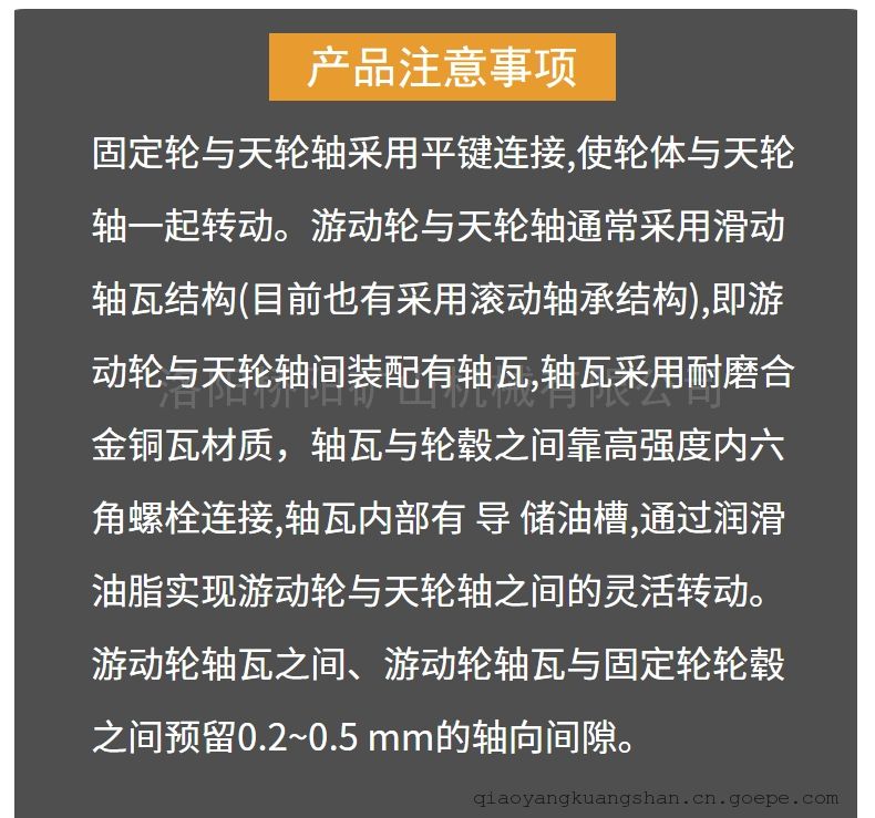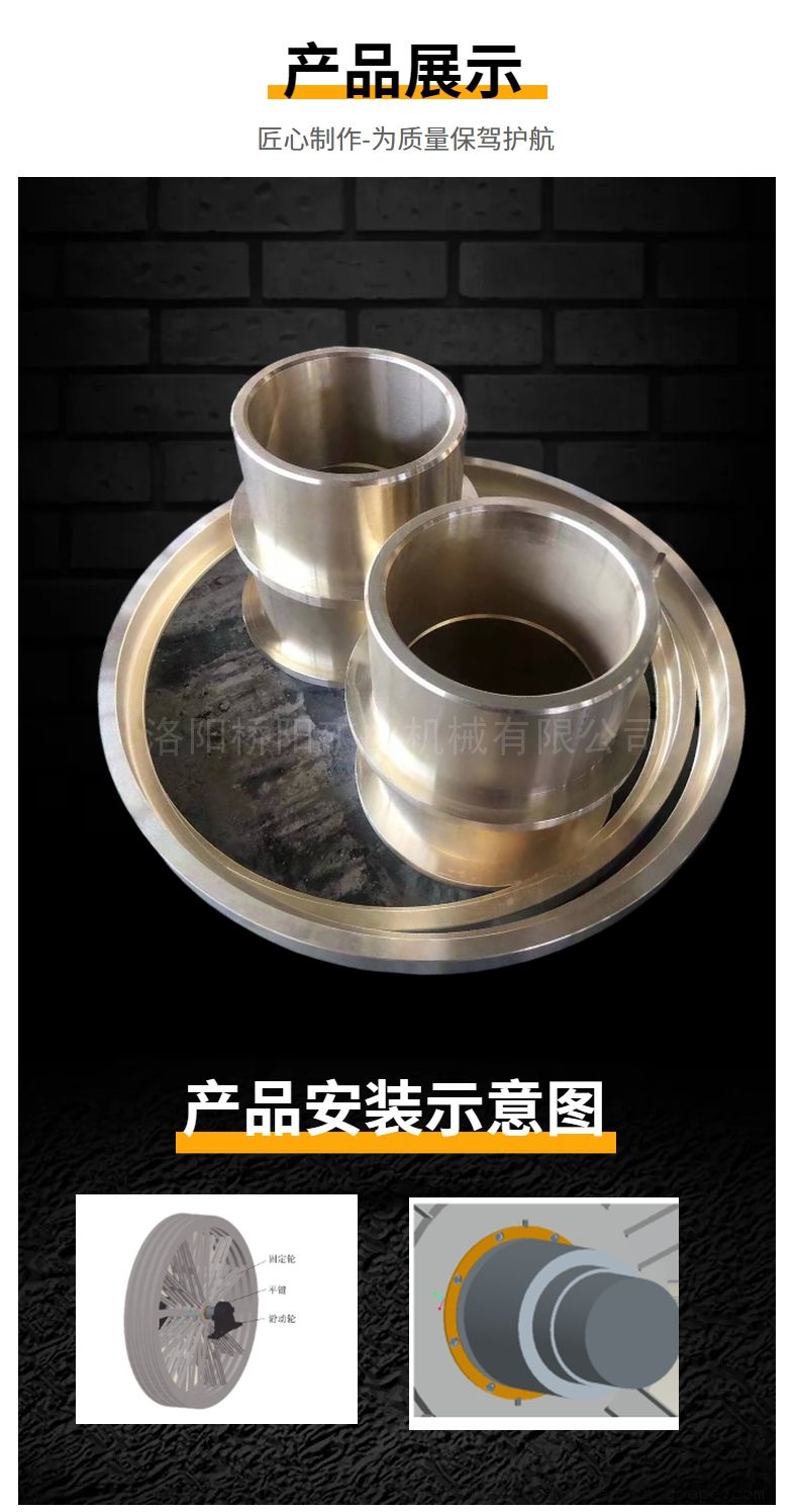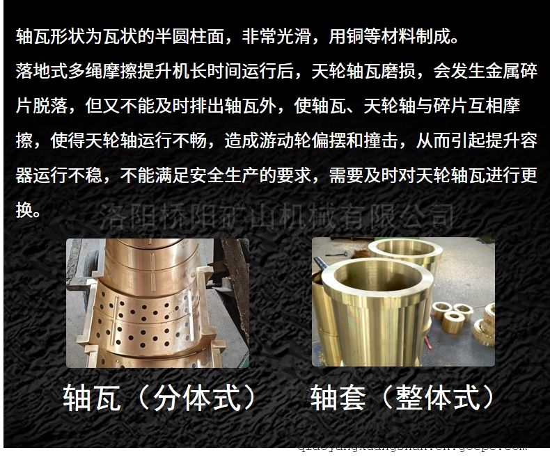产品的介绍:轴瓦形状为瓦状的半圆柱面,非常光滑,用铜等材料制成。落地式多绳摩擦提升机长时间运行后,天轮轴瓦磨损,会发生金属碎片脱落,但又不能及时排出轴瓦外,使轴瓦、天轮轴与碎片互相摩擦,使得天轮轴运行不畅,造成游动轮偏摆和撞击,从而引起提升容器运行不稳不能满足安全生产的要求,需要及时对天轮轴瓦进行更换。