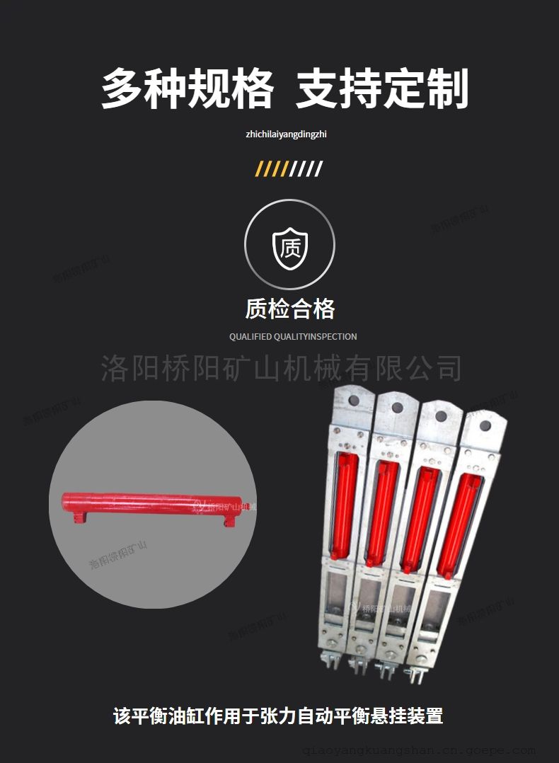 产品工作原理:矿用张力平衡油缸的工作原理是,通过增压杆(液压泵)使液压油经过一个单项阀进入油缸,这时进入油缸的液压油因为单项阀的原因不能再倒退回来,逼迫缸杆向上,然后在做工继续使液压油不断进入液压缸,就这样不断上上升,要降的时候就打开液压阀,使液压油回到油箱。